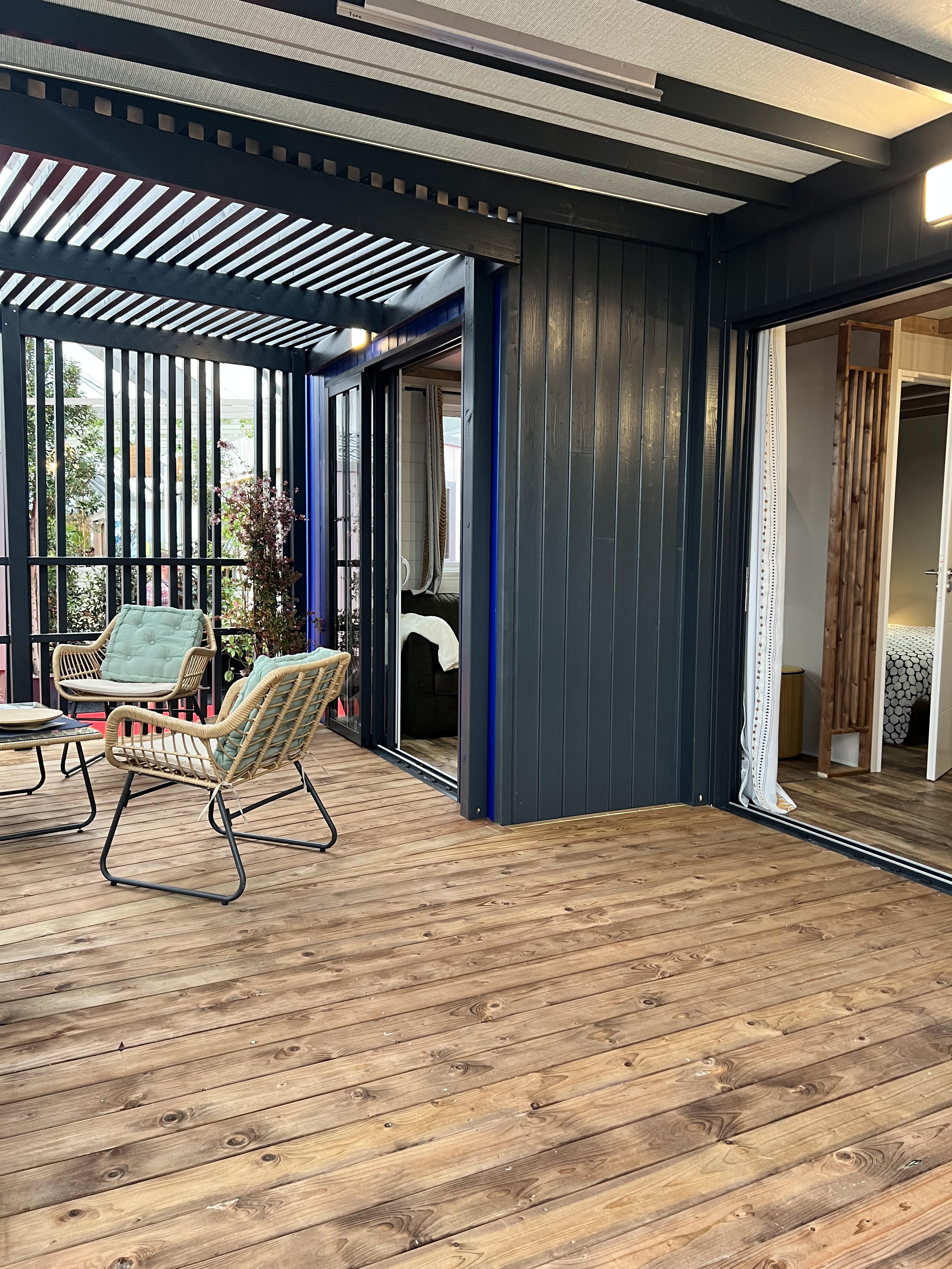 Het chalet is 35 m² groot en beschikt over een zeer ruim dubbel terras, waarvan een deel overdekt is.