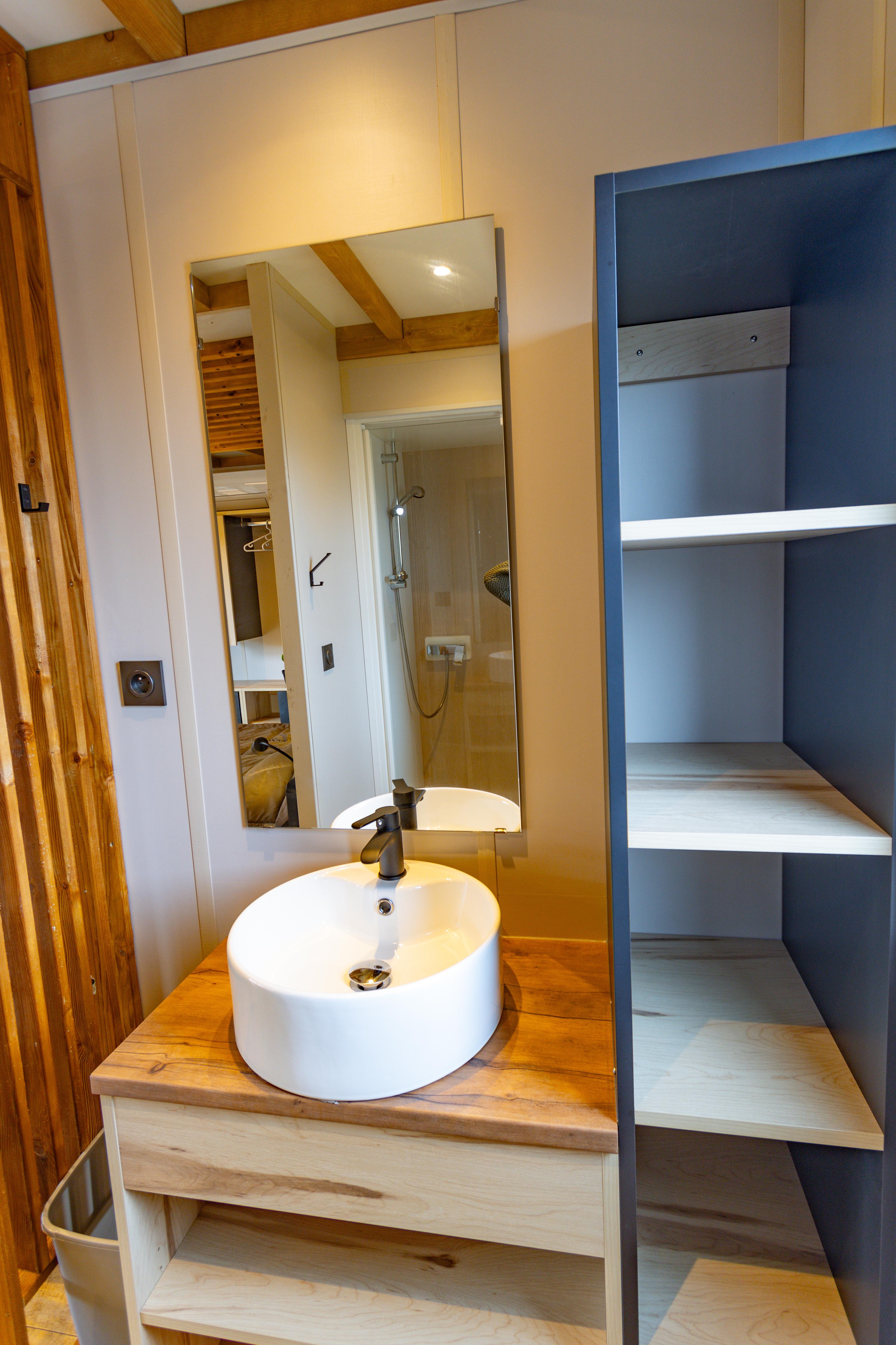 Voor een nog intensere natuurbeleving is dit chalet bewust niet toegankelijk voor auto's, zijn de aangrenzende standplaatsen gereserveerd voor tenten en zijn de terrassen op het zuiden gericht, richting het bos.