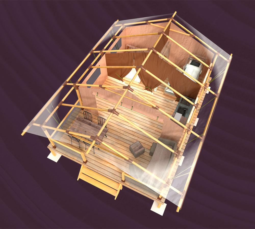 Une lodge en bois, toilée pouvant accueillir jusqu’à 5 personnes, est disponible à Lous Suais pour des séjours de 7 jours et plus (du samedi au samedi). La lodge fait 35 m2.